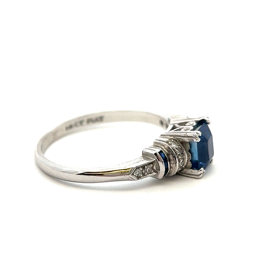 This precious, pre-loved 18ct white gold and platinum ring features a 1.50ct emerald cut ceylon sapphire in the center with six care' cut deep blue ceylon sapphires (TW 0.12ct) and 12 single cut diamonds (TDW 0.10ct, Colour GH, Clarity SI) along the sides of the ring.