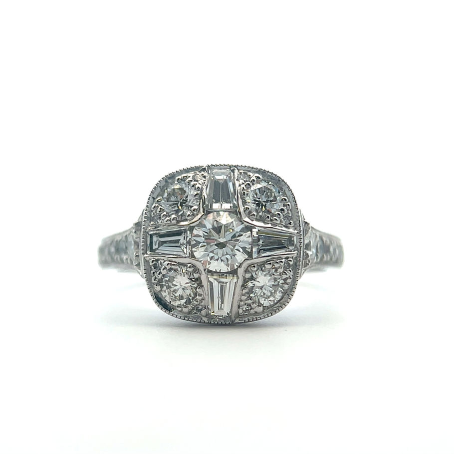 This gorgeous 18ct white gold art-deco ring features a 0.34ct diamond in the centre surrounded by 28 round and tapered diamonds (TDW 1.40ct, Colour GH, Clarity SI). The total diamond weight of this ring is 1.74ct.