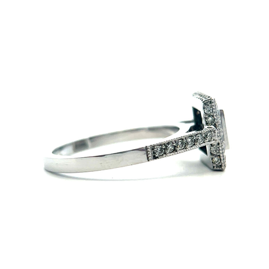 This stunning 18ct white gold engagement ring features a 0.42ct princess cut diamond with round brilliant cut diamonds down the side (TDW 0.40ct, Colour G, Clarity SI2). The total diamond weight is 0.82ct.