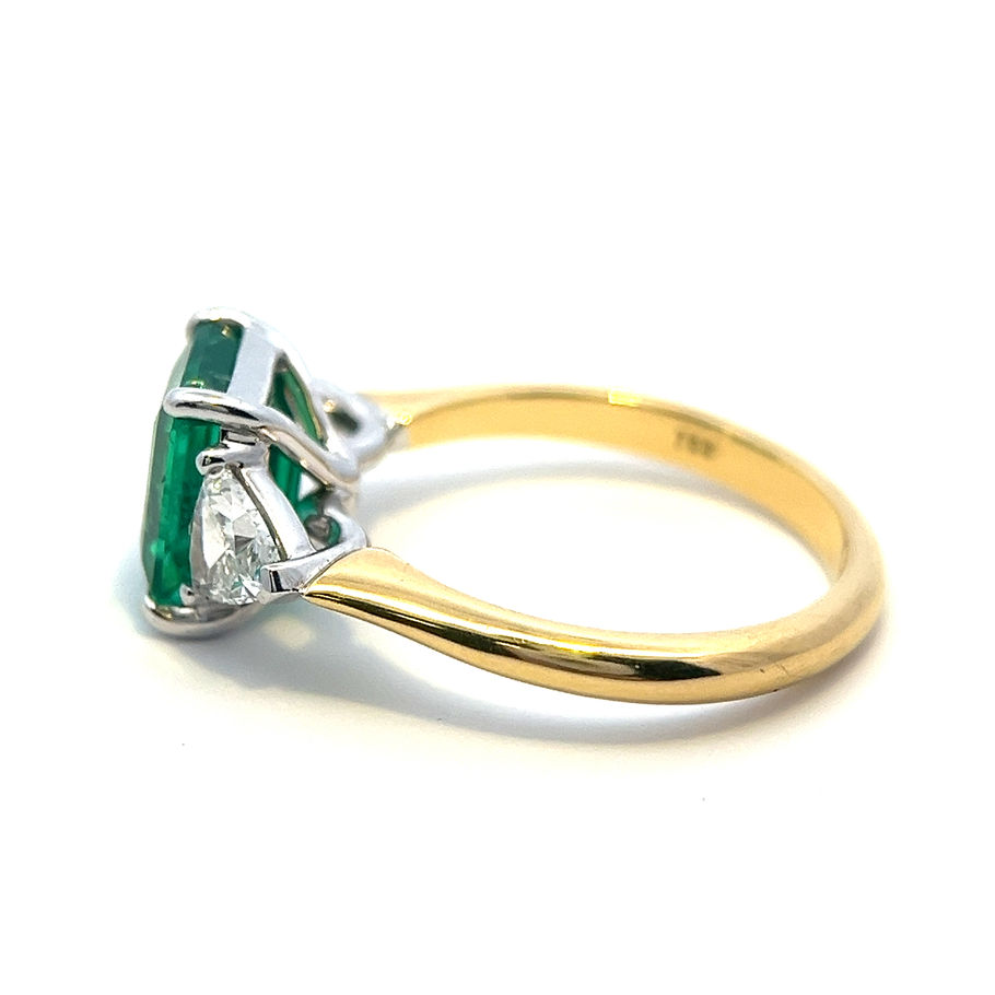 This gorgeous 18ct yellow and white gold ring features a stunning 2.86ct emerald cut, Zambian emerald, and is accompanied by two trilliant cut diamonds (TDW 0.77ct, Colour F, Clarity VS).