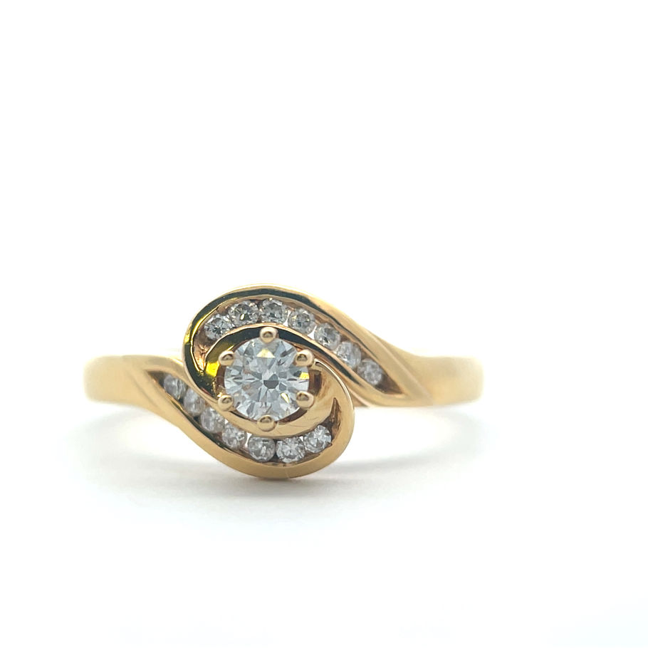 This stunning 18ct yellow gold engagement ring features a 0.17ct round brilliant cut diamond (Colour H, Clarity P), accompanied by 14 diamonds (TDW 0.14ct, Colour H, Clarity P1). The total diamond weight of this ring is 0.31ct.