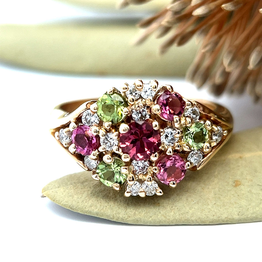 This beautiful, handmade, 18ct yellow gold ring features four pink tourmalines, three peridots and 14 round brilliant cut diamonds (TDW 0.52ct, Colour GH, Clarity SI).