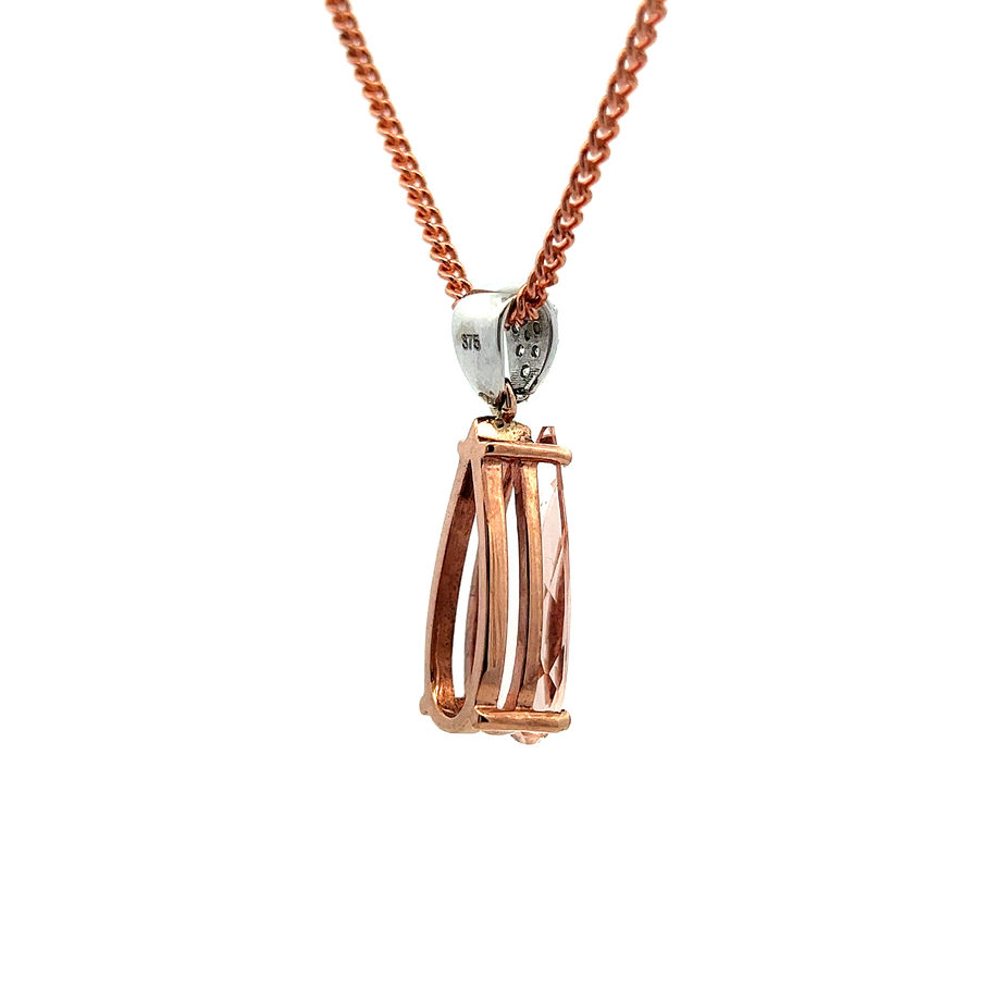 A pendant crafted in 9ct rose gold, featuring a 3.44ct morganite as its centrepiece. The elegant bail is pavé set with 10 round diamonds totaling 0.10ct.