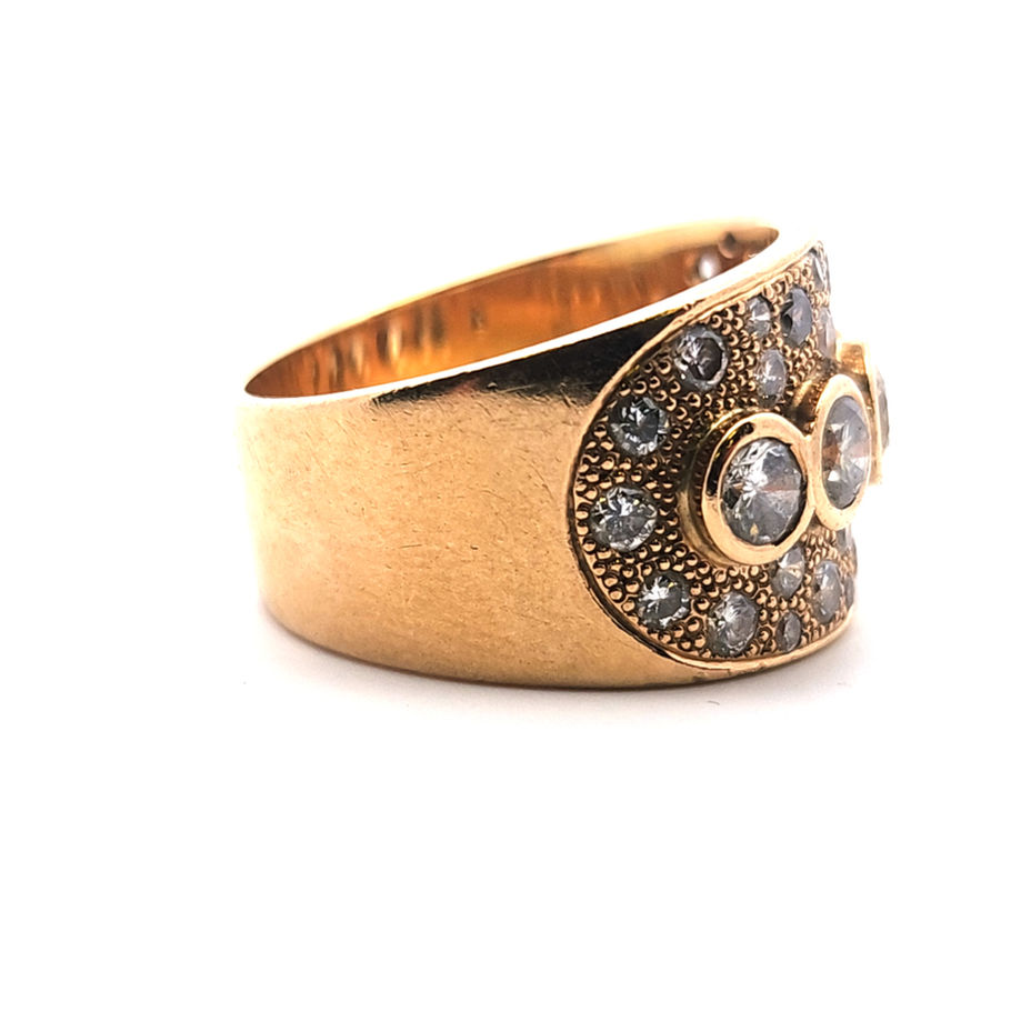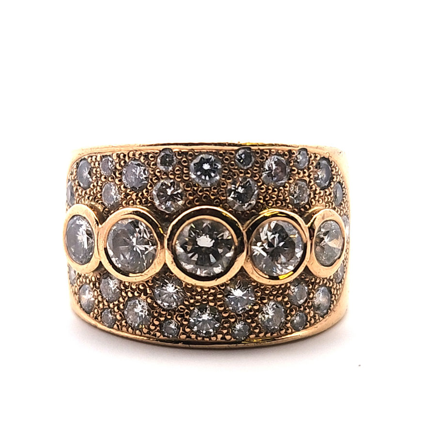 A beautifully handcrafted pre-loved ring in 18ct yellow gold, showcasing an impressive arrangement of G/SI and G/VS diamonds totalling 2.01ct. The design features three main diamonds totalling 0.81ct, two additional diamonds totalling 0.40ct, and a further 32 diamonds adding 0.80ct—creating a bold, sparkling presence from every angle.